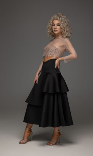 Rochie de ocazie din două piese este un outfit sofisticat și modern, ce combină stilul clasic cu o notă contemporană.Realizată din șifon-satin ,croiala legeră ,dar care pune în evidență formele feminine, datorită texturii fine a țesăturii a materialului.Fusta este fluidă, cu o cădere ușoară care se mișcă delicat la fiecare pas.
