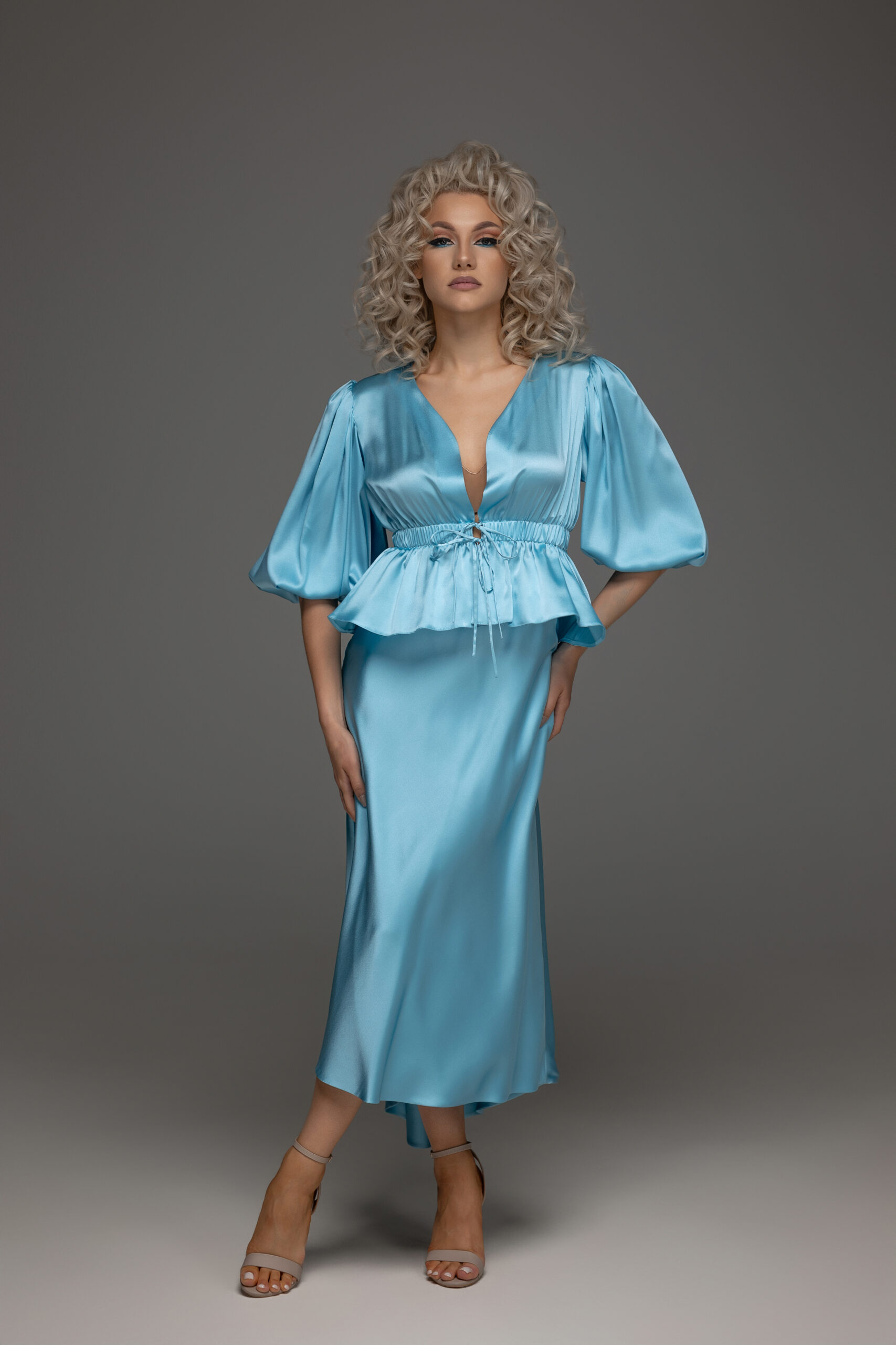 Rochie de ocazie din două piese este un outfit sofisticat și modern, ce combină stilul clasic cu o notă contemporană.Realizată din mătasă,croiala legeră ,dar care pune în evidență formele feminine, datorită texturii fine a țesăturii a materialului.Fusta este fluidă, cu o cădere ușoară care se mișcă delicat la fiecare pas.