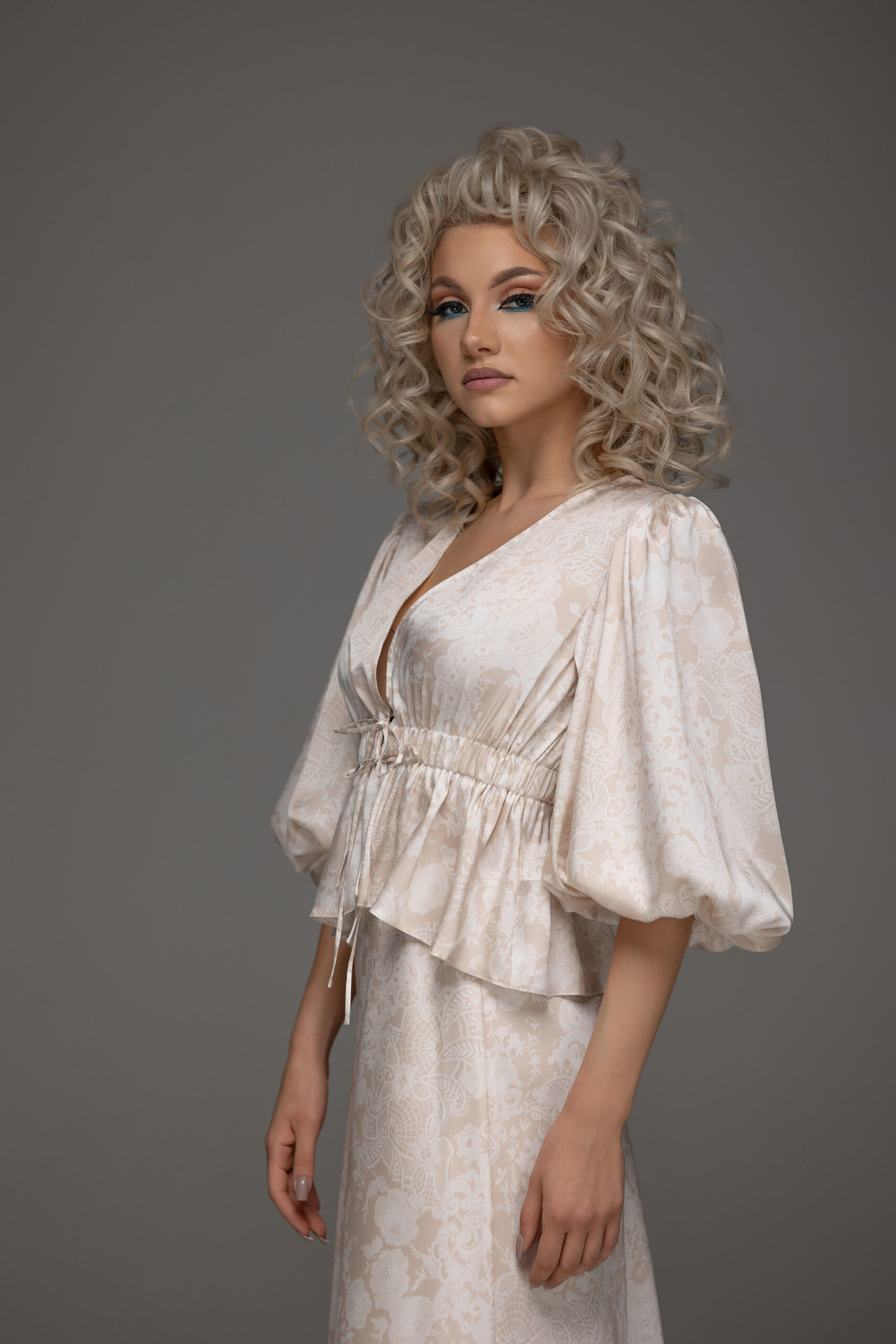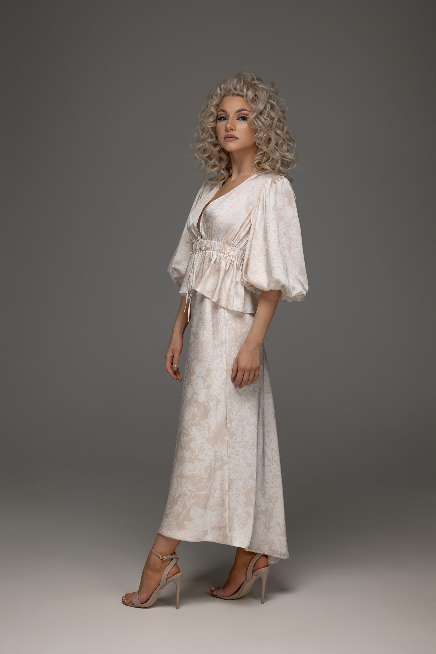 Rochie de ocazie din două piese este un outfit sofisticat și modern, ce combină stilul clasic cu o notă contemporană.Realizată din șifon-satin ,croiala legeră ,dar care pune în evidență formele feminine, datorită texturii fine a țesăturii a materialului.Fusta este fluidă, cu o cădere ușoară care se mișcă delicat la fiecare pas.